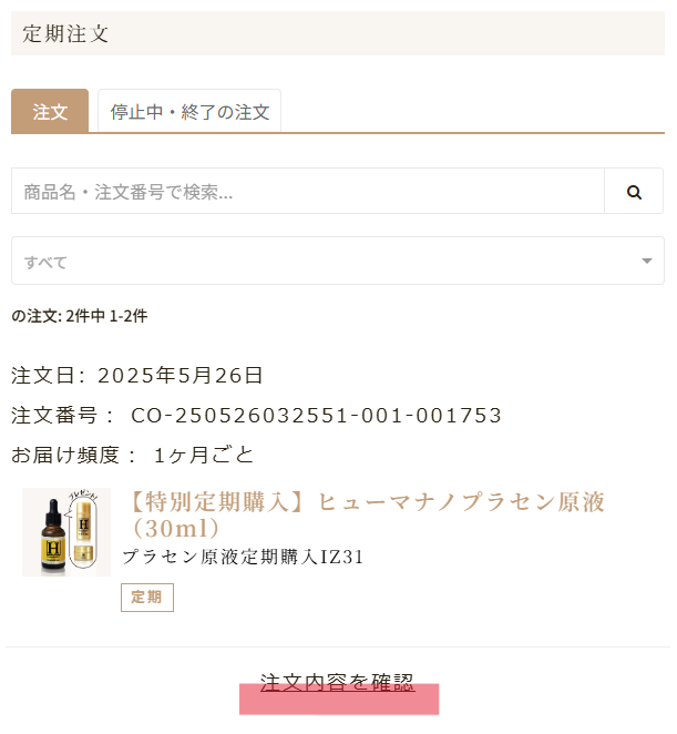 2. 確認したい定期商品の「注文内容を確認」をクリック |