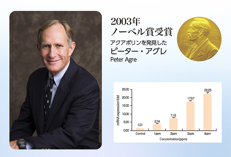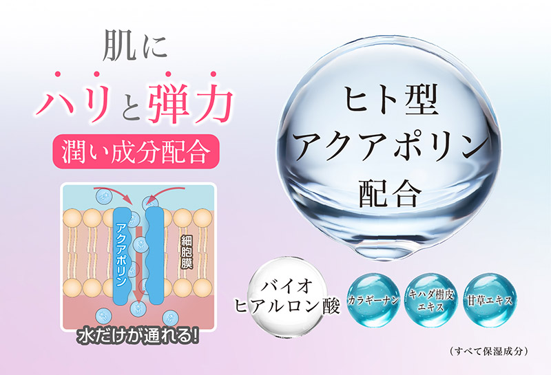 アクアポリンとは体の細胞膜に存在し水を通過させるという特別な性質をもつ成分で2003年にノーベル賞を受賞しました。肌内のアクアポリンが増えることで肌の水分バランスを整え、肌にハリと弾力を与えます。日本初のヒト型アクアポリンが肌内の水分をサポートし、肌に潤いとハリ、弾力を与えます。