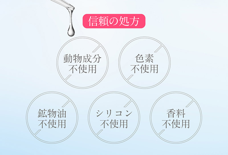 ヒト型プラセンタをはじめ肌をサポートさせる5大バイオヒト型成分配合(ヒト型プラセンタ、EGF、IGF-2、aFGF,TRX)しました。さらにヒアルロン酸Na、カラギーナンが肌に皮膜をつくり肌を保護します。またキハダ樹皮エキス、甘草エキス配合で透明感のある肌に導きます。 動物由来成分不使用、鉱物油不使用、香料不使用、色素不使用、シリコン不使用です。